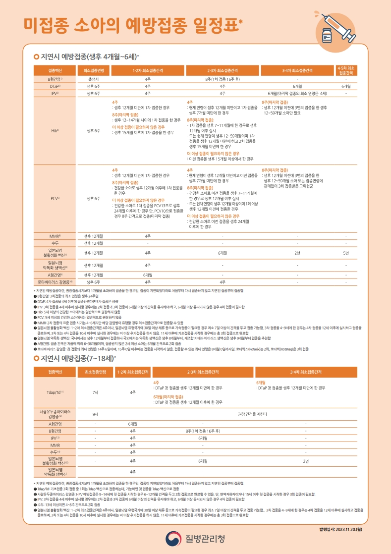 최상의 접종 효과를 얻기 위해서는 권장하는 접종 월령과 간격을 잘 지켜야 합니다. 만약 최소 접종 월령보다 일찍 접종하거나 간격이 짧았다면, 잘못된 접종으로 간주되며, 이 경우 최소 접종 간격 이상을 두고 다시 접종해야 합니다.