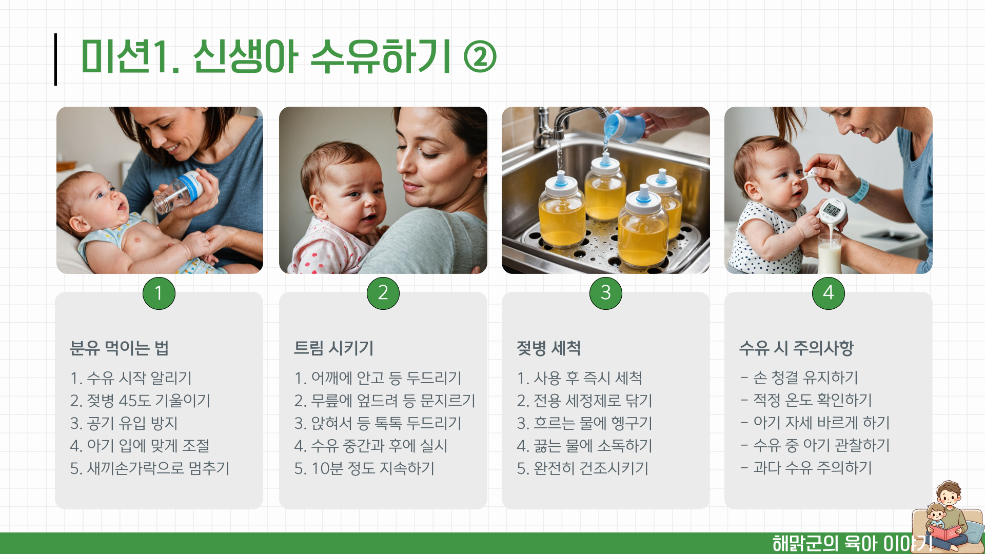 안녕하세요, 해맑군입니다! 처음 부모가 된다는 것은 설렘과 동시에 많은 걱정을 동반합니다. 특히 작고 연약한 신생아를 돌보는 일은 쉽지 않은 도전이죠. 그래서 오늘은 초보 부모님들을 위한 신생아 돌보기 4대 미션을 정리해보았습니다. 이 글을 통해 신생아 케어의 기본을 익혀 보세요!