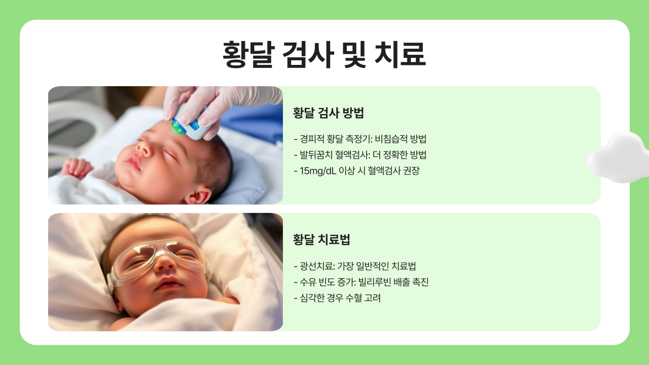 황달 수치는 경피적 황달 측정기나 발뒤꿈치 피검사로 측정할 수 있습니다. 발뒤꿈치 피검사가 더 정확한 방법이며, 특히 경피적 측정기는 높은 수치에서 정확도가 떨어질 수 있으니 주의가 필요합니다. 황달이 심할 경우에는 입원하여 광선치료가 필요할 수 있습니다.