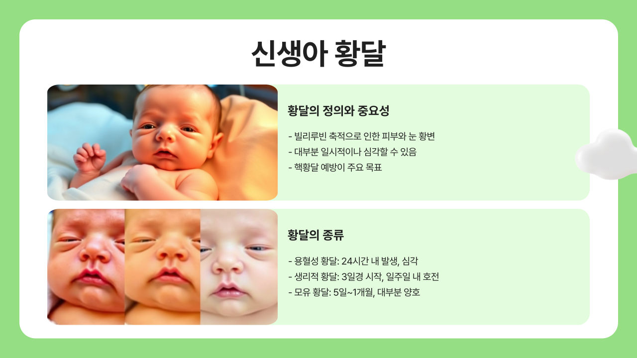 - 모유 황달: 생후 5일에서 1주일경에 시작되어 1개월까지 지속될 수 있습니다. 대부분 큰 문제 없이 호전되지만, 일부 아기들은 치료가 필요할 수 있습니다.