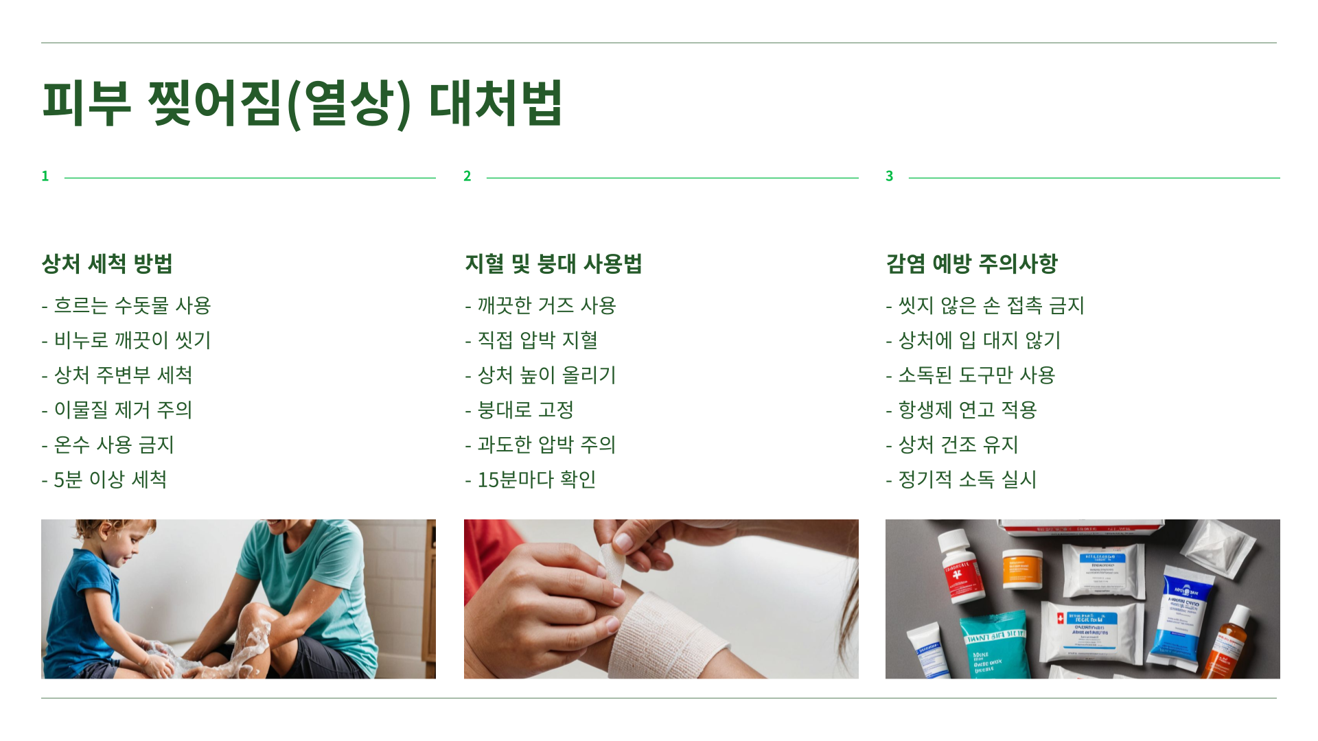아이의 피부가 날카로운 물건에 의해 찢어졌다면, 먼저 상처 부위를 흐르는 수돗물에 비누로 깨끗이 씻어야 합니다. 그런 다음 깨끗한 붕대나 거즈로 눌러 지혈합니다. 만약 상처에 이물질이 박혀 있다면, 그 부위를 움직이지 않도록 붕대를 감은 후 즉시 병원을 방문해야 합니다. 중요한 것은 씻지 않은 손으로 상처를 만지거나 소독제 외의 이물을 바르는 행위는 감염을 유발할 수 있으므로 피해야 합니다.