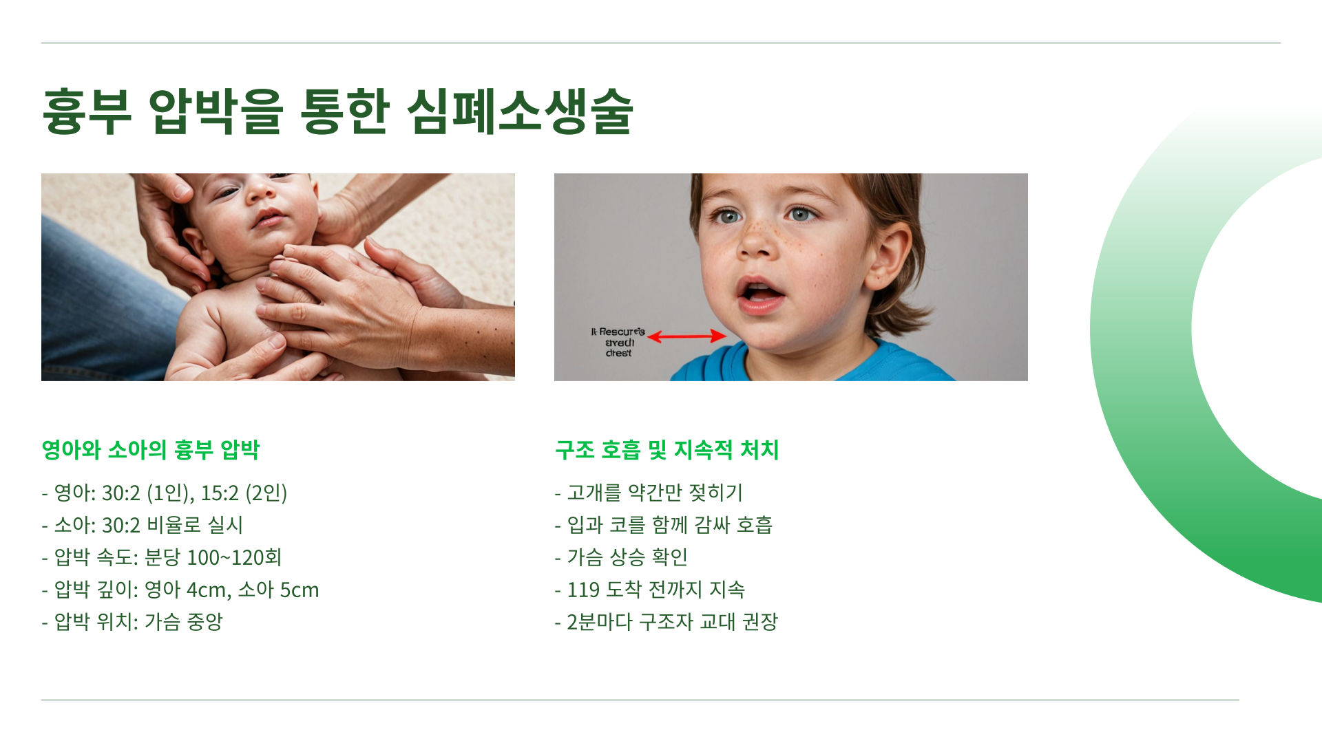 심폐소생술이 필요한 경우, 아이를 단단하고 평평한 바닥에 눕히고, 흉부 압박과 양압 환기의 비율을 조절해야 합니다. 1인 구조일 경우 30:2의 비율로, 2인 구조일 경우 15:2의 비율로 시행합니다. 흉부 압박은 분당 100~120회 정도로, 깊이는 영아는 4cm, 소아는 5cm 정도로 압박해야 합니다.