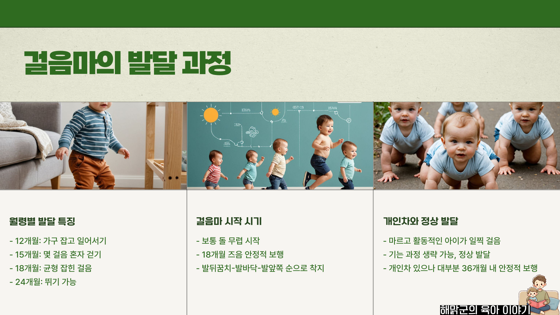 아이가 아장아장 걸음마를 시작했어요! 👣 ‘걸음마’는 아이의 발달 과정 중 가장 드라마틱한 순간입니다. 이제부터 아이는 자기 의지대로 이동할 수 있을 뿐만 아니라 두 손의 자유까지 얻게 되죠! 아장아장 잘 걸어 다니는 아이를 만드는 아빠의 걸음마 훈련 비법을 소개해드릴게요. 👶✨