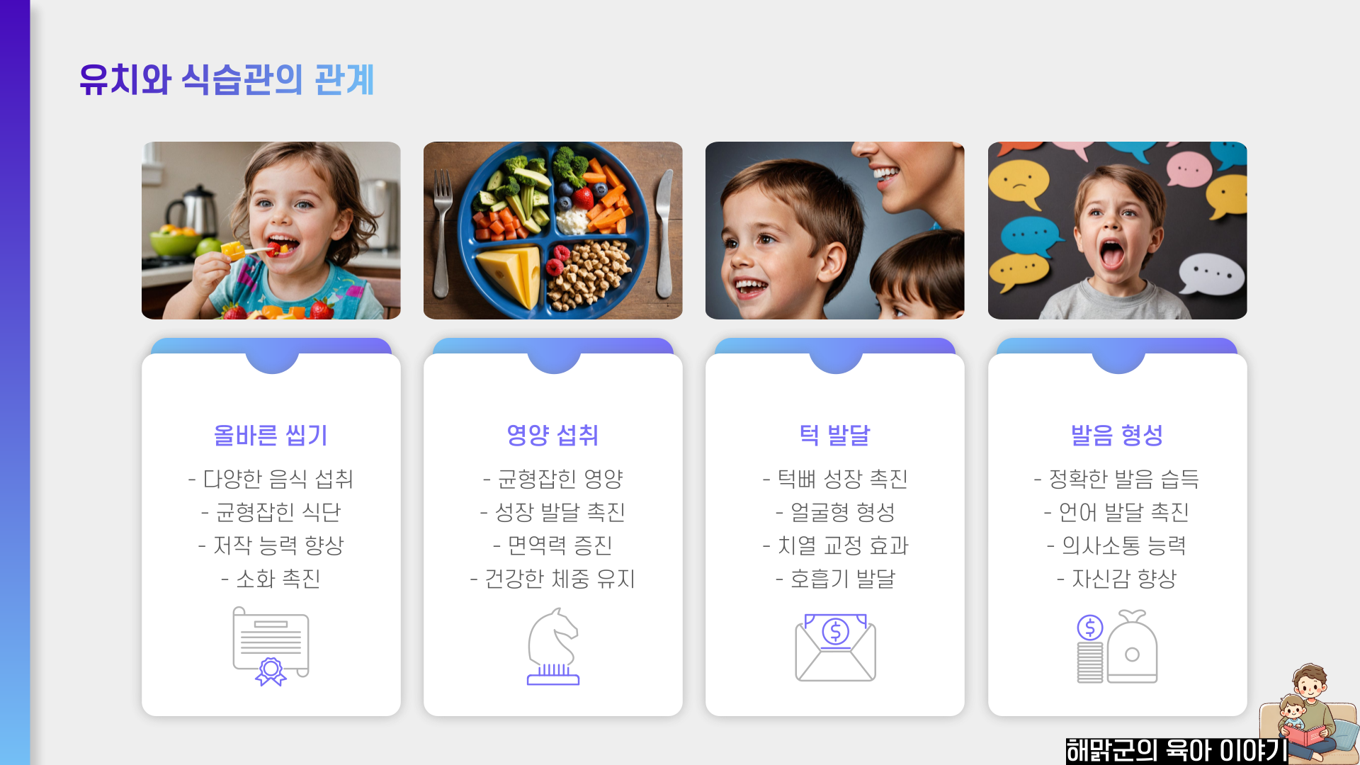 또한, 씹는 힘이 약하면 발음에도 영향을 줄 수 있어요. 일부 소리를 내는 데 치아가 중요한 역할을 하므로, 유치가 손상되거나 빠지면 아이가 발음하기 어려운 소리가 생길 수 있답니다. 🤔